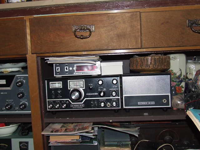 There's a Drake TR3 transceiver, a Drake 2-B receiver and a Johnson Viking II with a Uniden scanner way on top. Not shown is a Drake L-4B amp.... It's locked up for safe keeping!!!